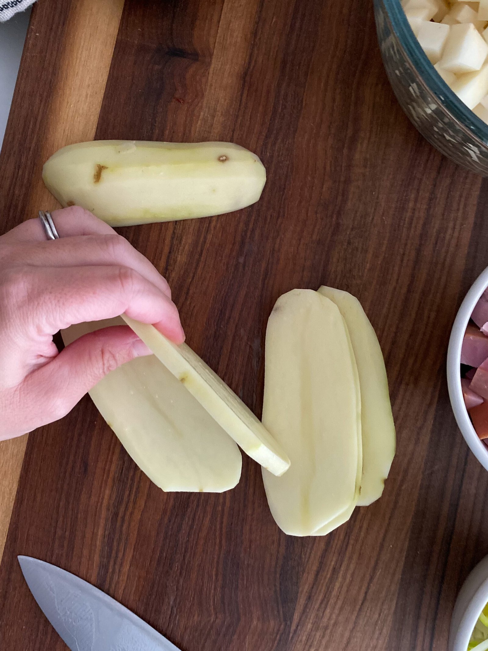 Starchy potatoes like the Russet really become hard to cut. You will notice that the potatoes stick to the knife and will leave a white residue on the knife. If it becomes too hard to manage, use a kitchen towel and wipe off the residue to help make cutting easier.