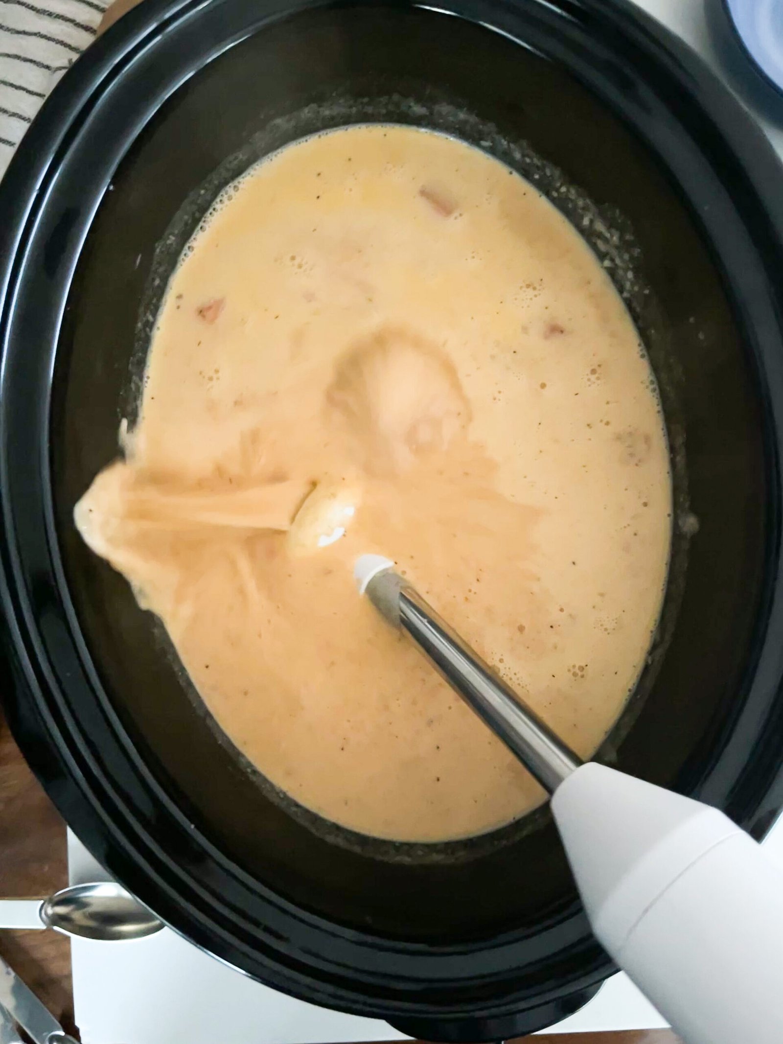 I use an immersion blender straight into the crockpot, but if you do not have an immersion blender you can a regular blender. Note, with a regular blender, remember to work in batches if necessary. Only fill it up about half way with soup because the heat will make it expand in the blender and you do not want it to explode overtop.