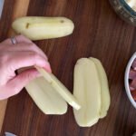 When you cut the potatoes the potato should be cut into small bite size cubes for even and easy cooking.
