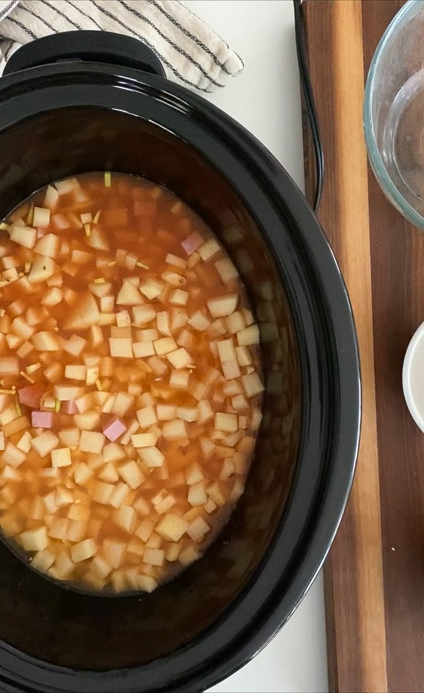 • In a crockpot, add the leek, half of the ham steak - ¼ inch cubed, cubed potatoes, salt, smoked paprika, bay leaf and chicken stock. Make sure the potatoes are submerged in the stock, if you need it, add a cup of water.