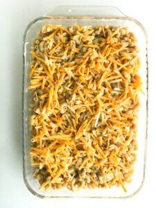 - Butter your 9×13 casserole dish – bottom and sides. Pour your macaroni and cheese into the dish. Try to spread it out as evenly as possible.