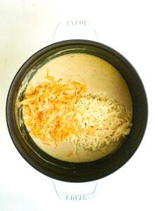 - Take off the heat. Add in your cheeses, keep about a 1/2 cup of cheese for the topping. Stir the mixture until the cheese is melted and evenly combined.