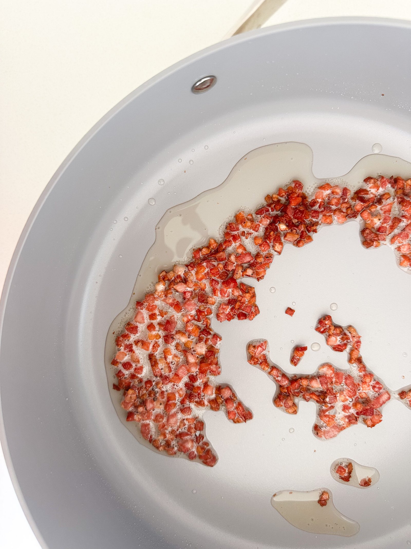 - As the pancetta is browning, cut the jalapeños and onion into small diced pieces.2-3 Jalapeños, 1 Sweet Onion