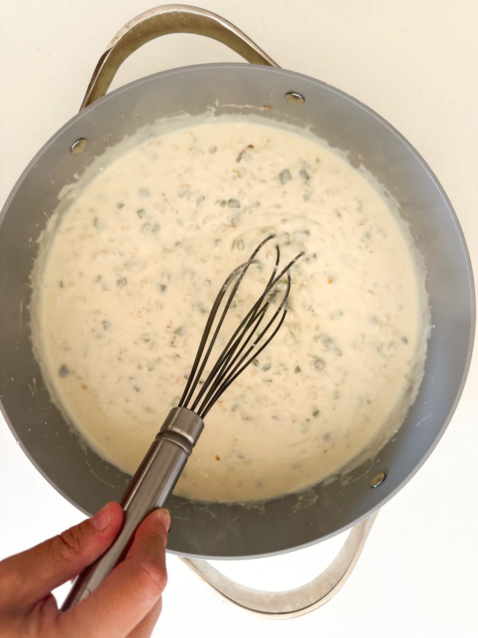 - Do not let the milk come to a boil, continue stirring over low heat until the cream cheese is melted and the sauce is thick. Turn off the heat.