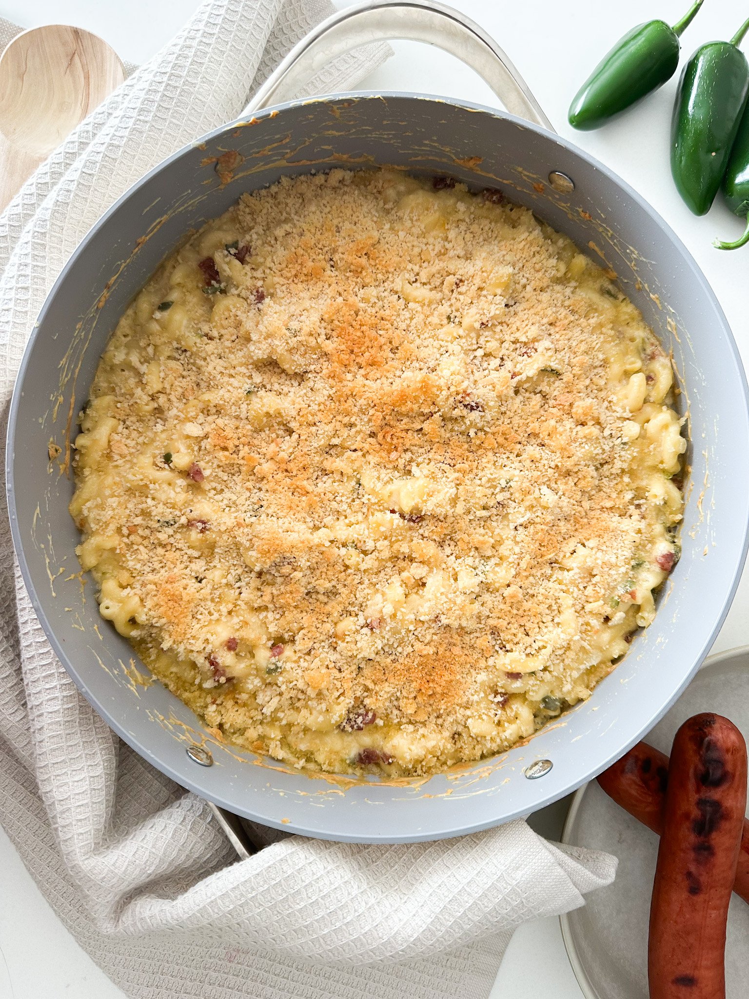 Jalapeño popper mac and cheese for the win! Creamy, cheesy and with a little kick of spice topped with a crunchy buttery breadcrumb layer. Grab a spoon and dig in!