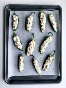 - Fill the peppers up with the cheese mix. Depending on how big your peppers are, you can get 10-14 peppers filled up. If your peppers are super small you can get more. I stuff my peppers to the max with the cheese filling.