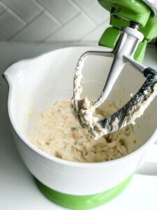 - Mix together the bacon, cream cheese, sour cream, cheese and salt until combined. You can use a kitchen aid mixer or your spoon-stirring-muscles, it should come together pretty easily.