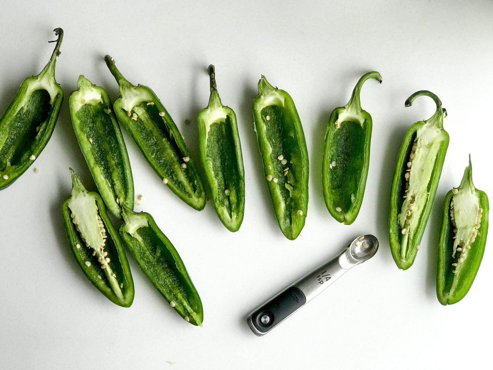 - Slice the Jalapeños in half lengthwise and remove the rib and seeds. I usually use a 1/4 teaspoon to scrape the rib and seeds out of each pepper. You can leave in seeds to increase the spice level, the more seeds you leave the spicer it will be. Be careful not to touch your eyes or nose!