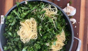 • Using tongs, add your cooked pasta to the pan with the kale, shallot and garlic. Toss together.