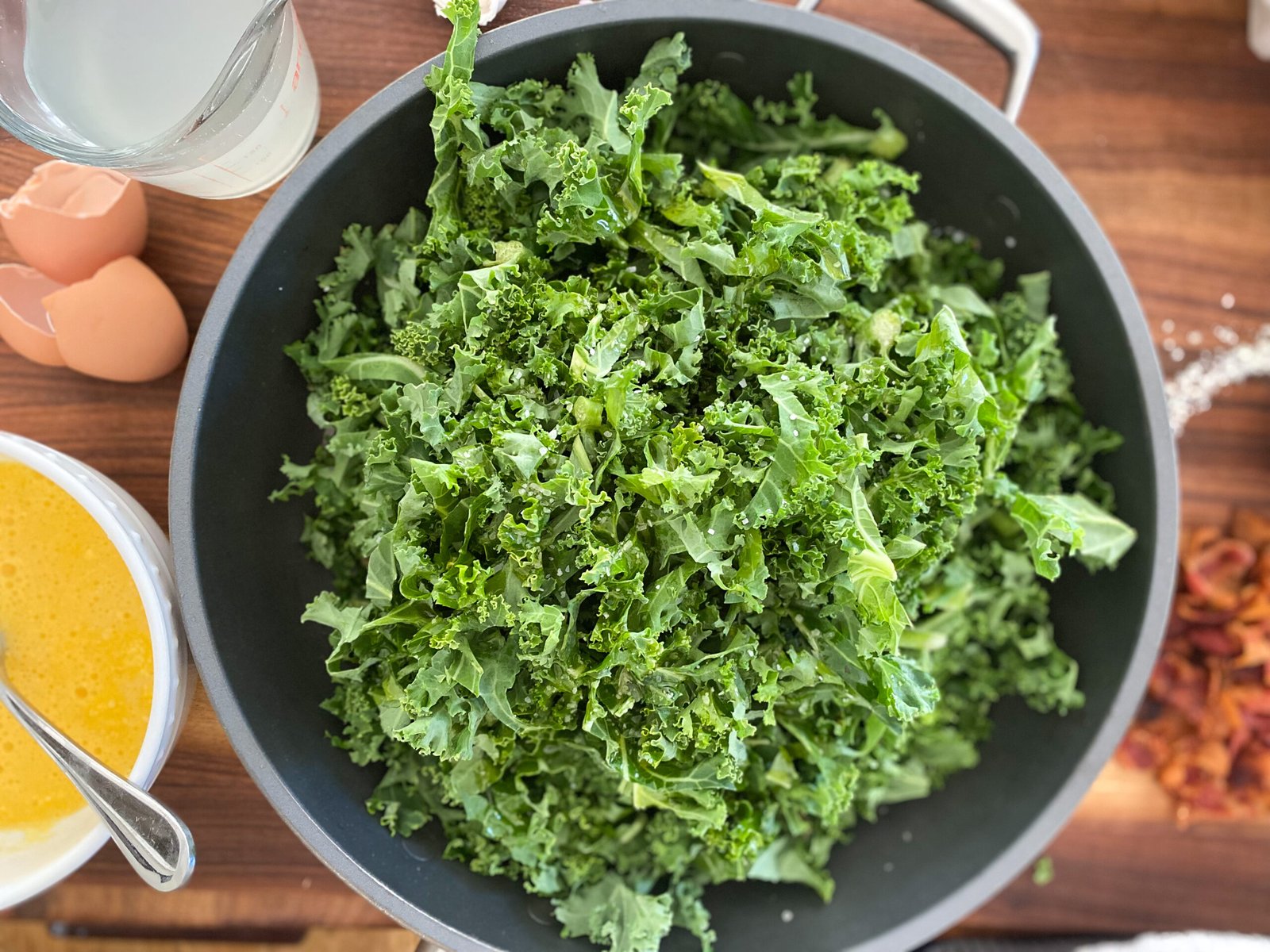 • While the kale cooks down, in a bowl whisk your eggs. Stir in the Parmesan cheese and set aside.