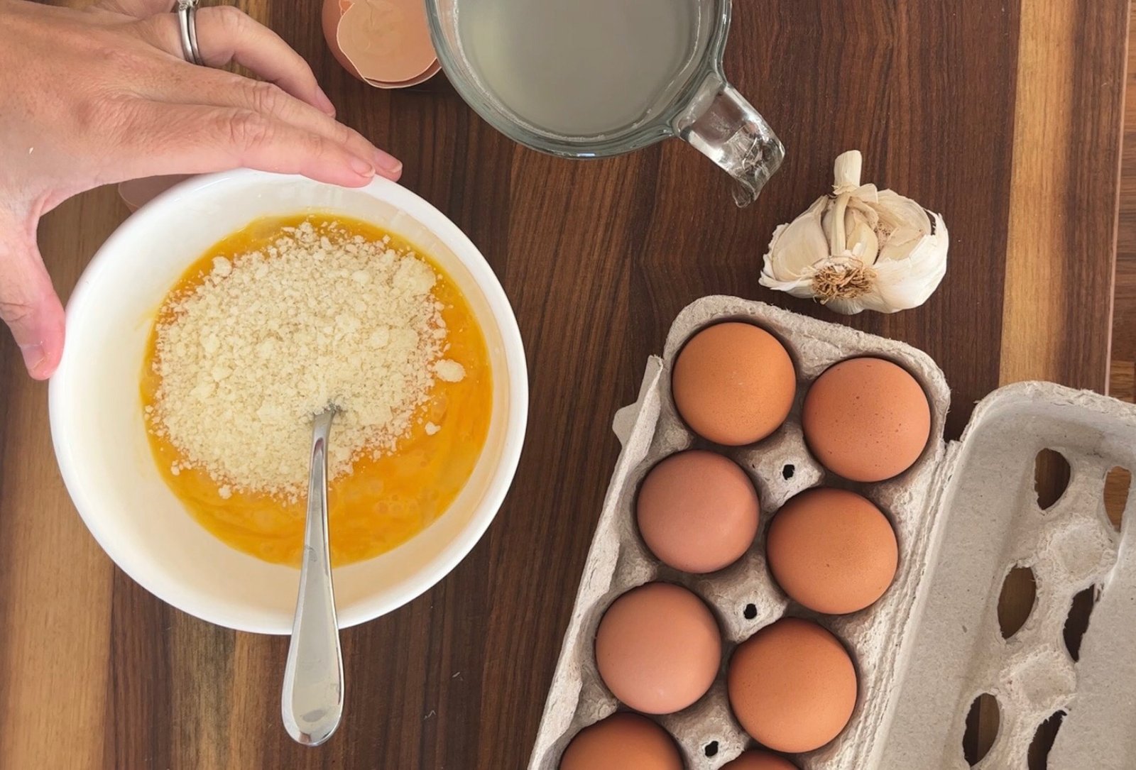 • In the bowl with your eggs and parmesan cheese, whisk and pour in ¼ cup of the hot pasta water to temper the eggs.