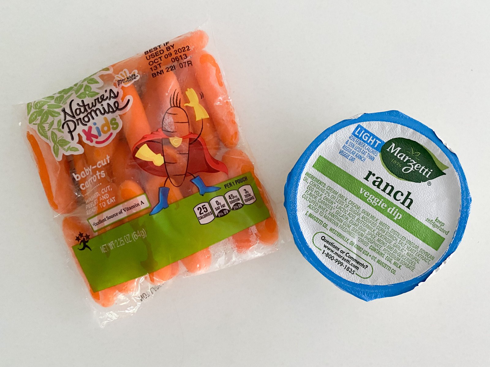 Also dip! Kate loves to dip, so I picked up these mini ranch dippers. I also grabbed these individual carrot packages but it’s a lot of carrot for one little toddler, so I end up splitting the bag between both girls. If I’m going to be honest, I’d rather buy real size carrots and just cut them myself, they last longer.