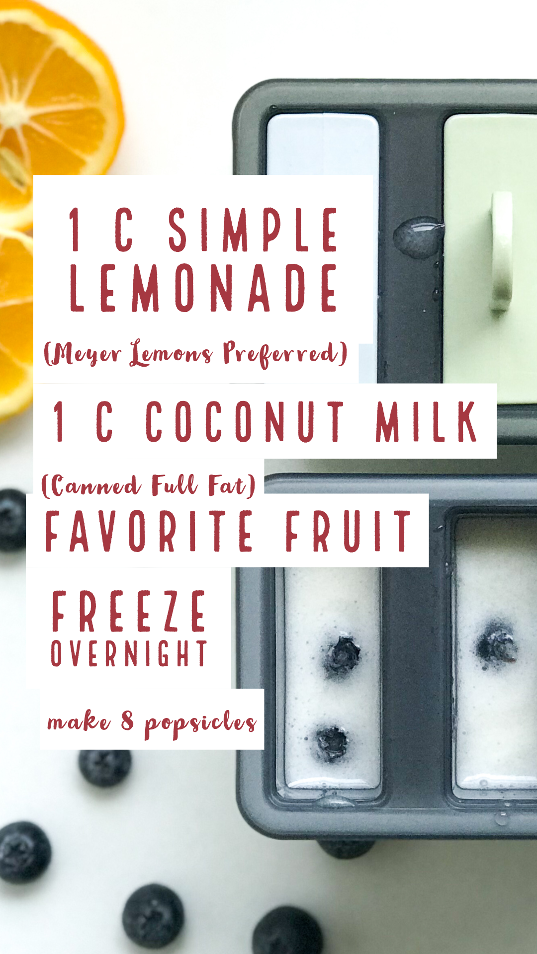When I was testing this recipe I noticed that the type of coconut milk is important. For the creamy white (as seen in this picture above), you need to use full fat unsweetened coconut milk. You can buy this in a can. I like the 1/2 lemonade and 1/2 coconut milk look, but you can add more coconut milk if you want your entire popsicle to be white and creamy.