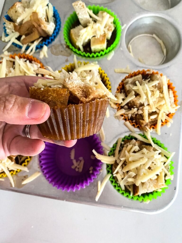 You can then pop out the soups from the muffin liner and store in large food container or plastic bag in the freezer.