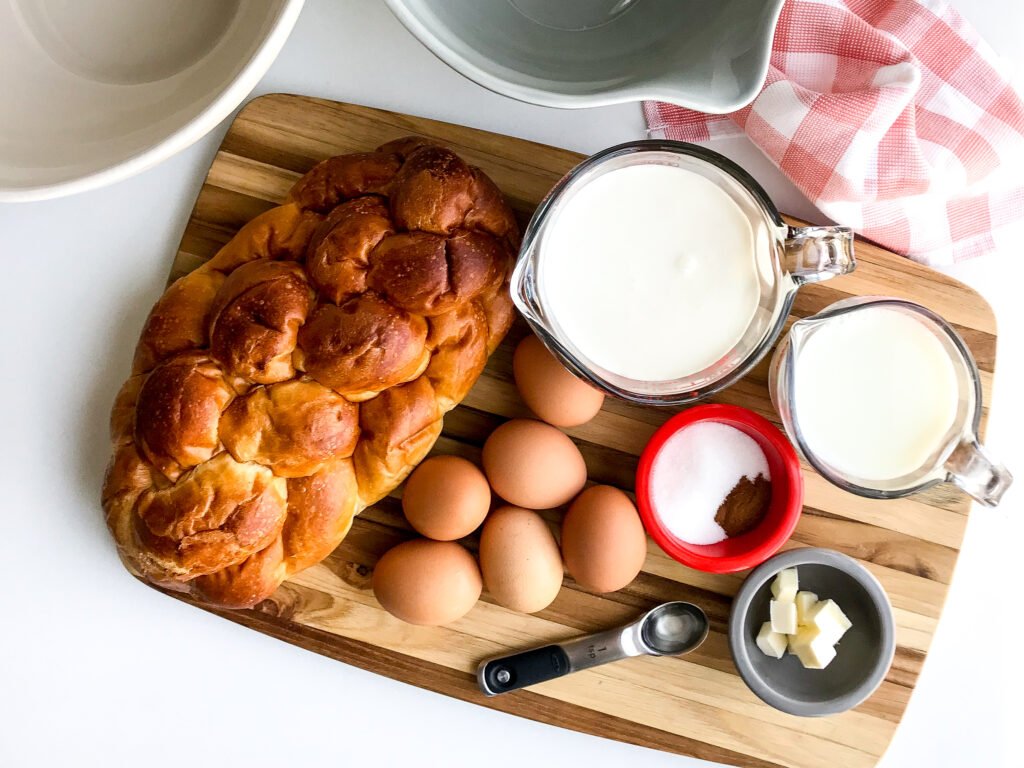 - In a bowl whisk the eggs. Add in the cream and milk, almond extract, 1/2 tsp of cinnamon and sugar until combined. Set aside.