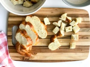 - Cut the bread up into 1 inch cubes, and place in a large bowl.