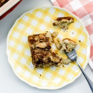 - Pour the french toast mixture into the casserole pan, top with your diced butter squares and 1/2 tsp of cinnamon.