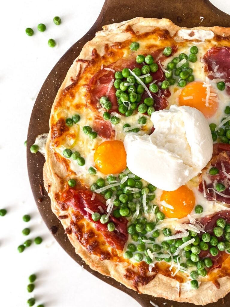 Let’s level up this pea carbonara pizza with crispy prosciutto, thinly sliced leeks, fresh Parmesan, peas, perfect sunny-side up eggs and of course ball of creamy soft Burrata cheese for the top. We are living our best pizza-life right now. I mean it’s just gorgeous when it comes together right?