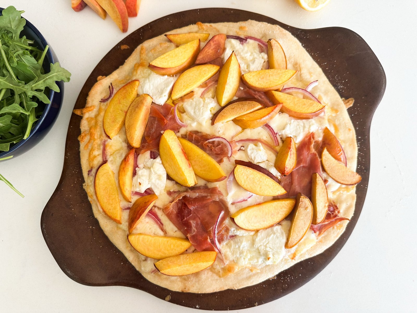 This peach prosciutto pizza is best with just-ripe or slightly under ripe peaches so that they keep their shape and bite after baking in the oven. When picking them, make sure they are firm all the way through.