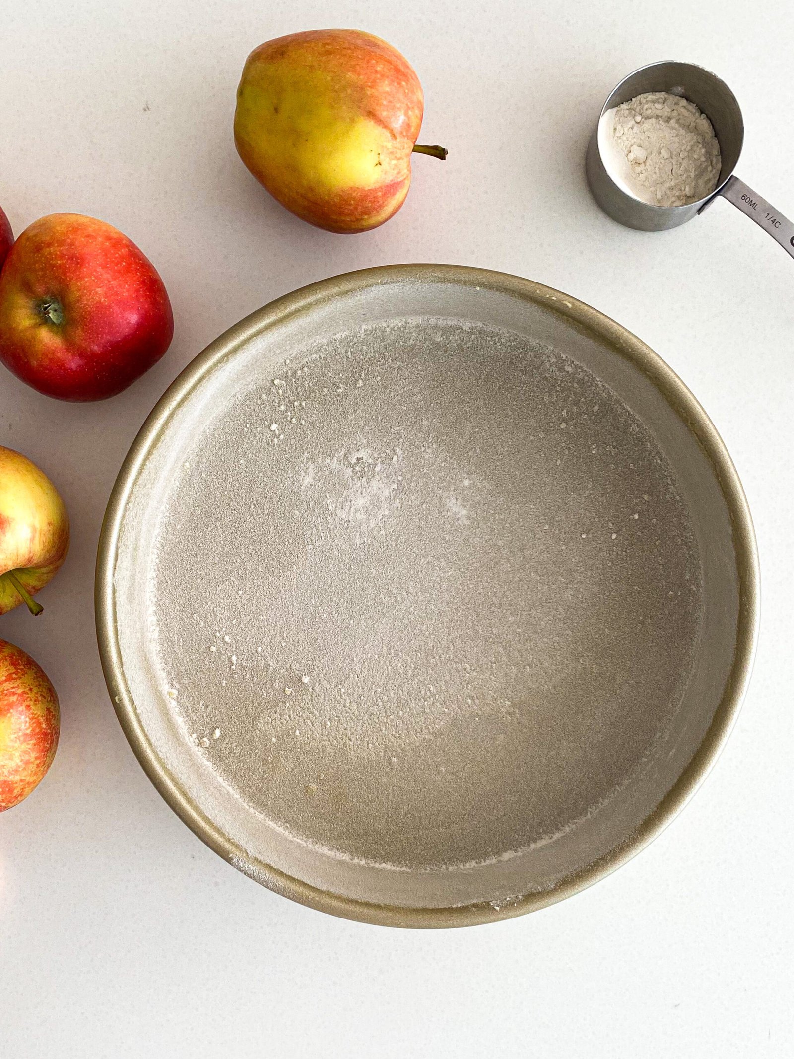 - Preheat your oven to 350F. Spray and dust your 9 inch cake pan with flour.