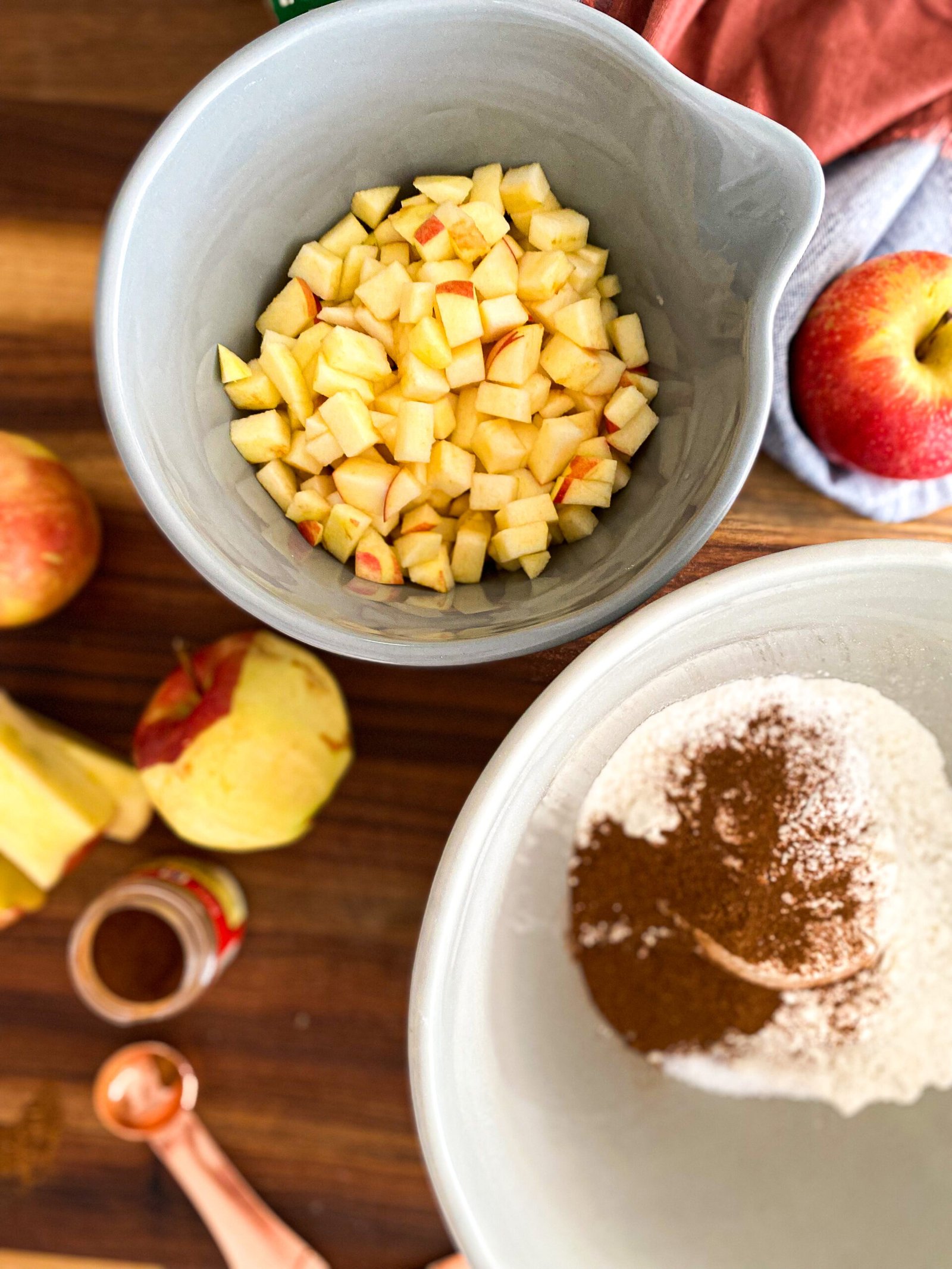 - Peel and dice your apples and set aside. In a bowl measure your dry ingredients (flour, baking powder, salt, apple pie spice) whisk to combine and set aside.