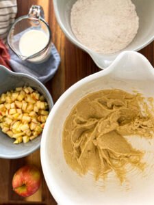 In the recipe below you will use two bowls and a liquid measuring cup. In the first bowl will be your dry ingredients (flour, baking powder, salt, apple pie spice). The second bowl will have your wet ingredients (butter, sugar, egg, vanilla extract). The measuring cup will have a 1/2 cup of milk at room temperature.
