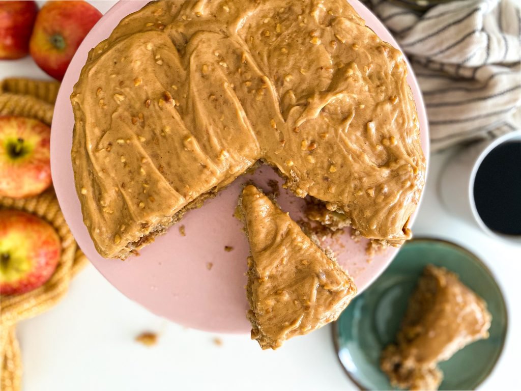 It is perfectly dense and airy at the same time. The cake crumb is soft and moist with a crunchy peanut butter frosting that is not too sweet. Truly a match made in heaven with the soft sweet apples.