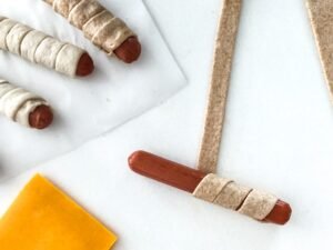 • Roll out your pizza dough and cut into thin ¼ inch wide slices. Roll your hot dog up into the strip of dough with the side touching as much as possible.
