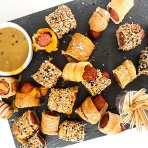 Pigs in a blanket are the ideal game-day watch party food. They are self-serve, dip-able, and bite-size, and these homemade hot dog pretzel rolls are a leveled up version of the original – a definite must have for the big game!