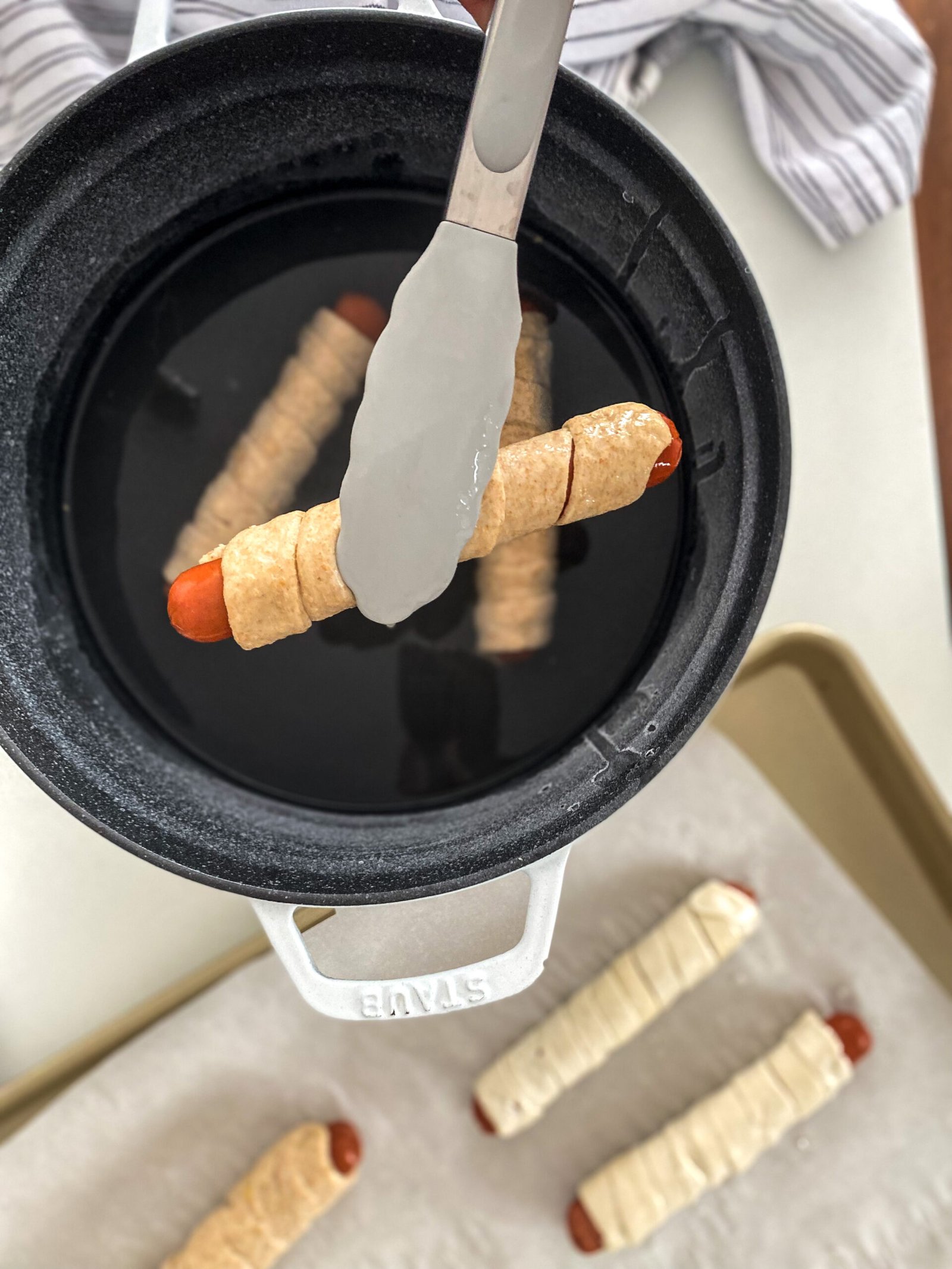 • Once the water is up to a boil, remove from the heat. Using tongs, carefully dip the dough-wrapped hot dog into the water making sure it's fulling submerged, then place on the parchment lined cookie sheet.