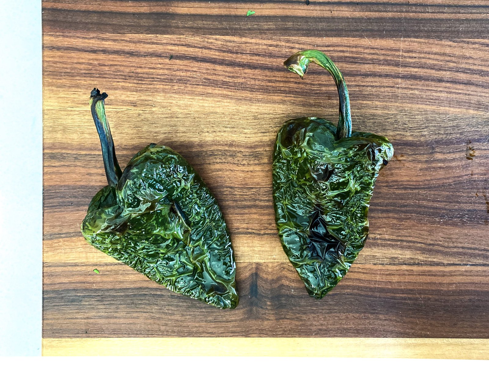 - Set your oven to a high broil. Line a sheet pan with foil and set aside. Rub olive oil over the surface of the peppers and broil for 10 minutes and flip to the other side for 5 minutes, until the skin blisters. Set aside and let cool. Preheat your oven to 350F.