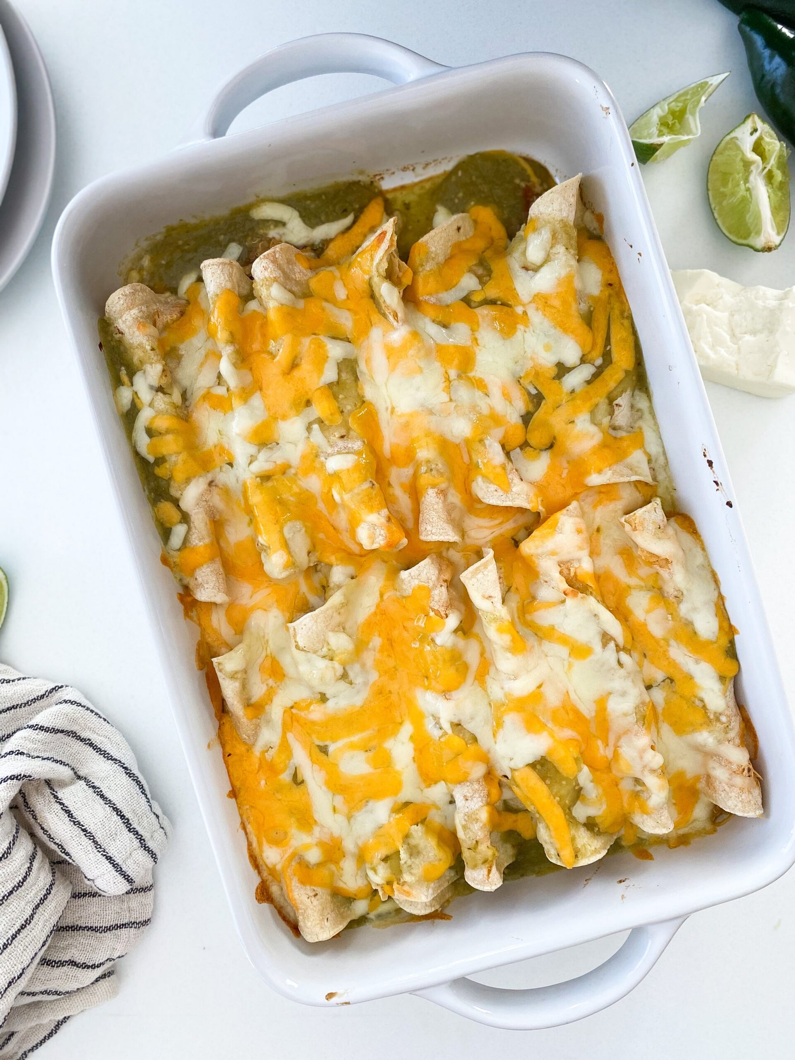 It’s so easy to make after work or prep ahead of time. They are also a great make and take to another friend’s house. We often make enchiladas to take to our friend’s house – we bring dinner and they host s’mores in their backyard. All you have to do is set the enchiladas in the casserole dish, cover and store in the fridge for up to 2 days and bake when ready!