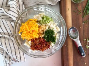 - While the potatoes are warm add in your sour cream, cheddar cheese, garlic, chives, green onions, and bacon. Stir until the potatoes are creamy and the ingredients are evenly distributed throughout. Give it a quick taste test. If the flavors are a little dull, add in a pinch of salt to wake up the ingredients.