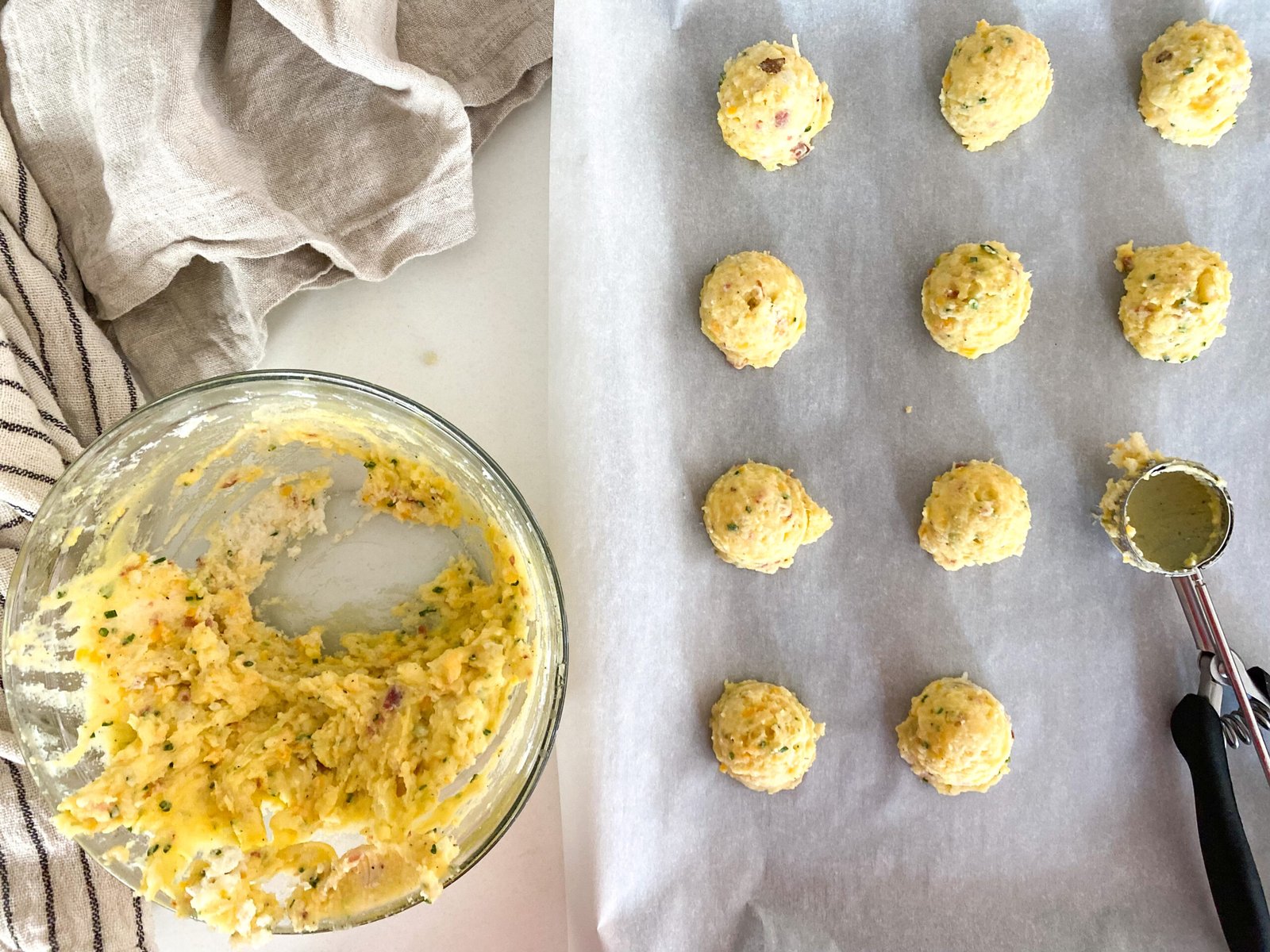 - Using a spoon or cookie ball scoop, you can scoop out your potato balls.= (about 1 inch balls). Set them aside on a cookie sheet lined with parchment paper.