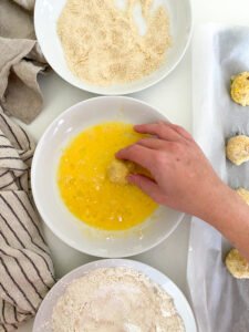 - Roll flour covered potato ball into the egg mixture, let the excess drip off.