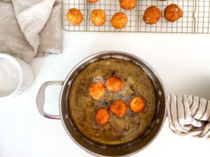 - You will cooking them for about 2-3 minutes and then turn them upside down to finish cooking and browning – about 5 minutes total.