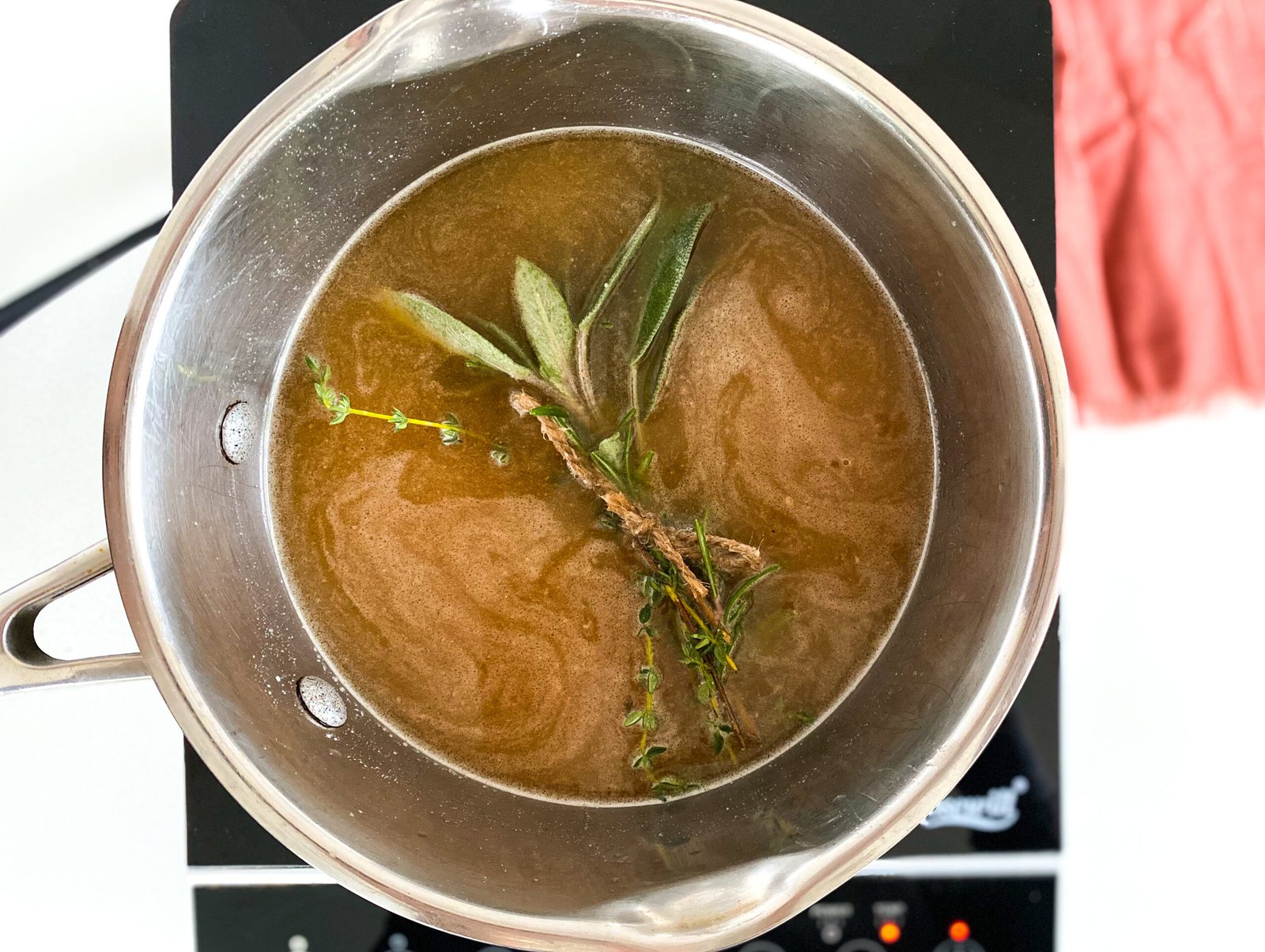 Herbs – you’re choice, you can skip them. I like to tie up a bouquet of fresh herbs just to give it a little extra warm-cozy flavor, but it’s totally optional. You can do this and leave in the little pieces that break off (like my picture) or you can strain the gravy before serving.