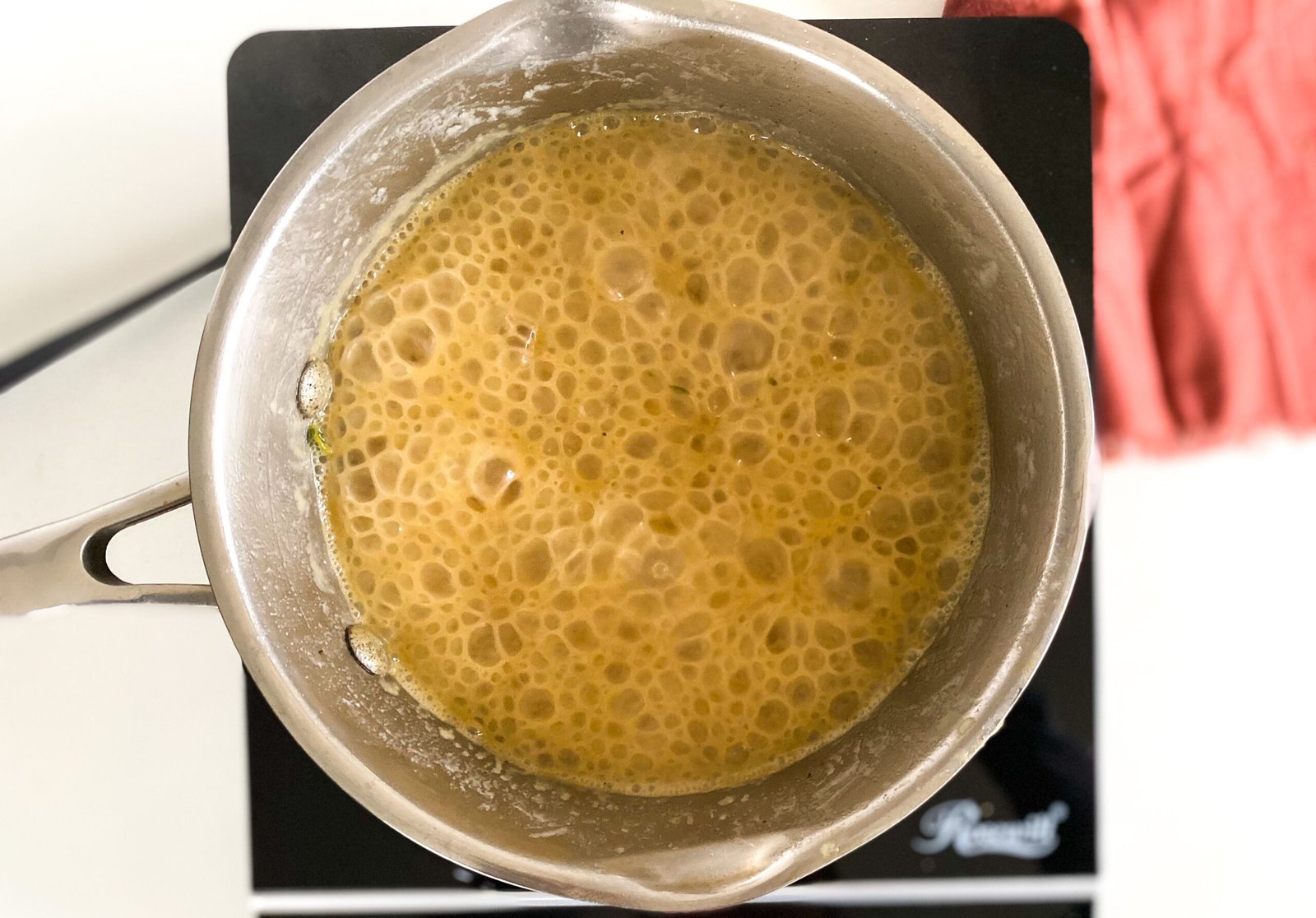 - In a pot over medium heat melt the butter. Add in your flour. Stir to mix until it looks like wet sand.