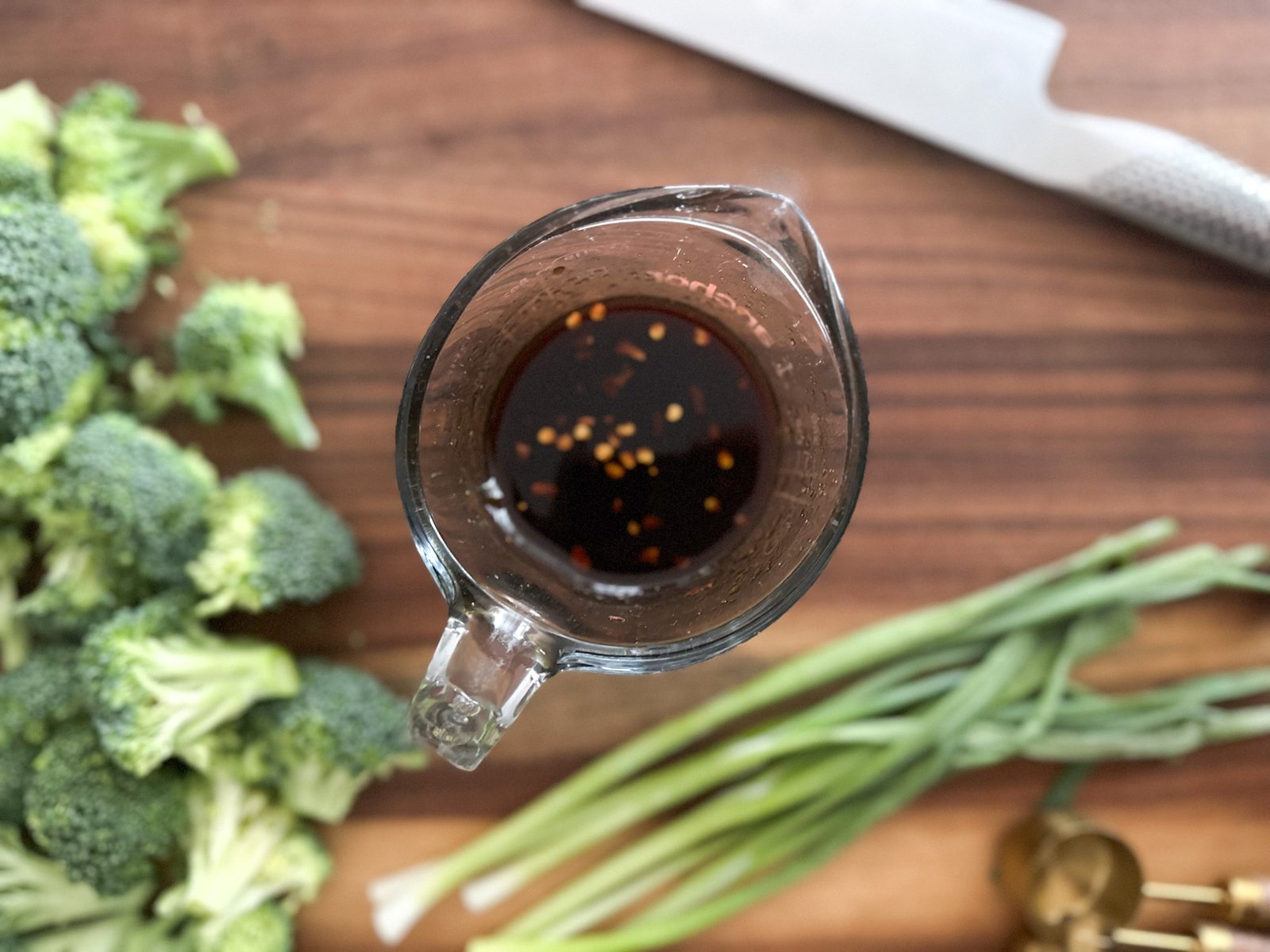 - As the chicken cooks, mix together the sauce - whisk together the soy sauce, hoisin sauce, rice vinegar, brown sugar and red pepper flakes and if you haven't already done so, cut up the broccoli.