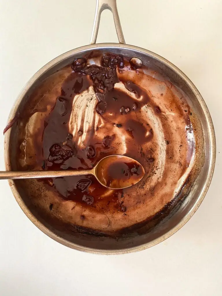 - Pour in the red wine.If using a stainless steel pan, with a wooden spoon, scrape up any brown bits so that the flavor is reincorporated into the sauce.