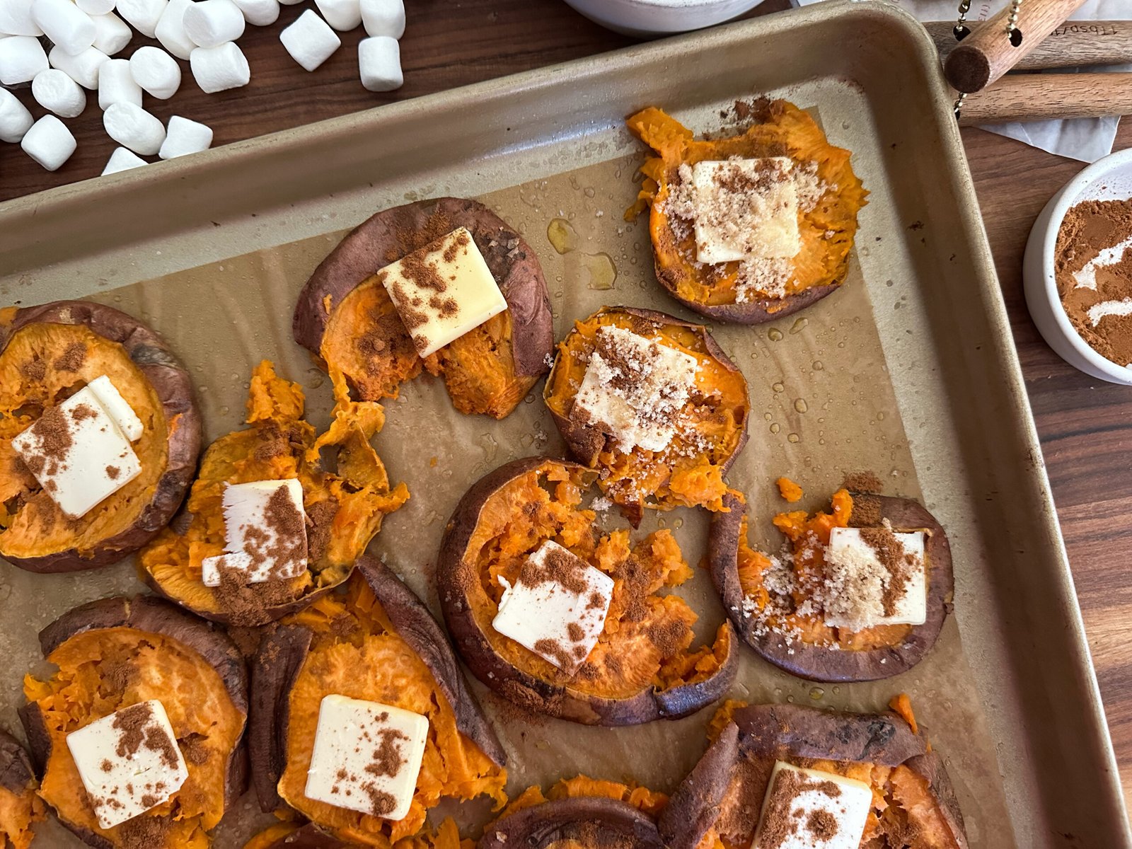 Sheet-pan candied smashed sweet potatoes are a fun way to change up the classic sweet potato casserole. The ratio of sweet potato to the melted butter, brown sugar and marshmallow is top-notch.
