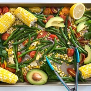 Summer sheet-pan succotash is such a great way to throw together vegetables for any weeknight dinner or backyard cookout. All of the summer favorites come together, baked to perfection and tossed in a warm vinegar dressing, there is something for everyone.