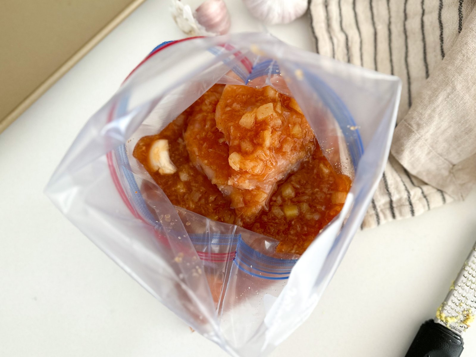 - In a large ziplock bag or other food container, add the chicken and marinade, making sure the chicken is submerged. Let it marinate in the refrigerator for 2-24 hours.