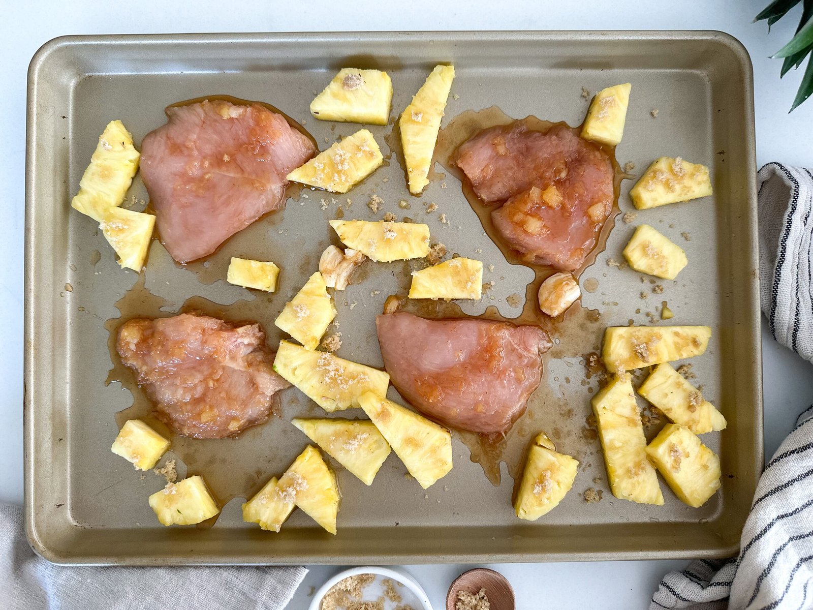 - On a sheet pan, add the marinaded chicken and pineapple chunks. Add a little brown sugar on the top of the pineapple. Bake for 10 minutes.