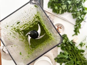 Similar to pesto, chimichurri is a raw sauce that is made by blending the ingredients together until it is a smooth thick consistency. The flavors are strong but when added to the top of grilled steak, fish or eggs, the flavors will be less intense but will still add a delicious fresh zing.
