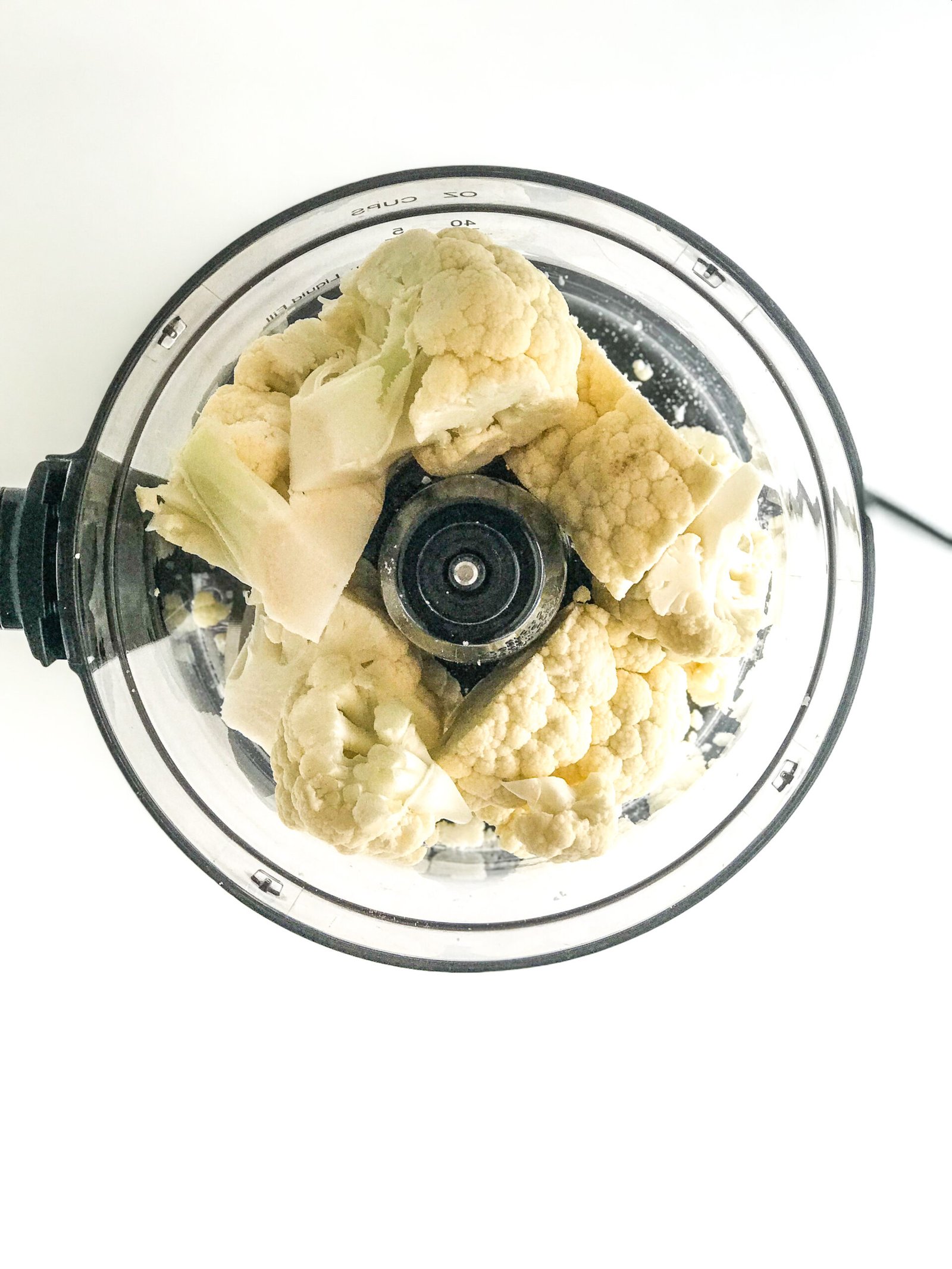 - Dump out the cauliflower into a bowl and measure out one cup. Add that one cup back into the food processor.