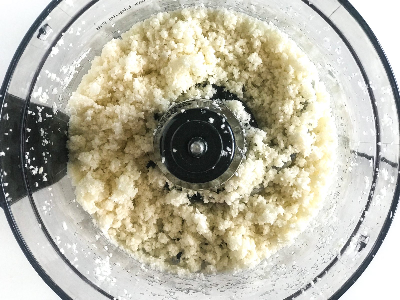 - Using a food processor, pulse the cauliflower until appears to be “rice” consistency. (see picture in step 3)