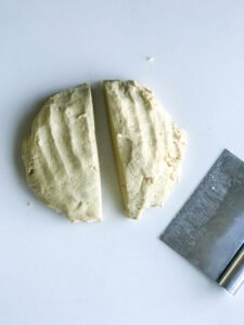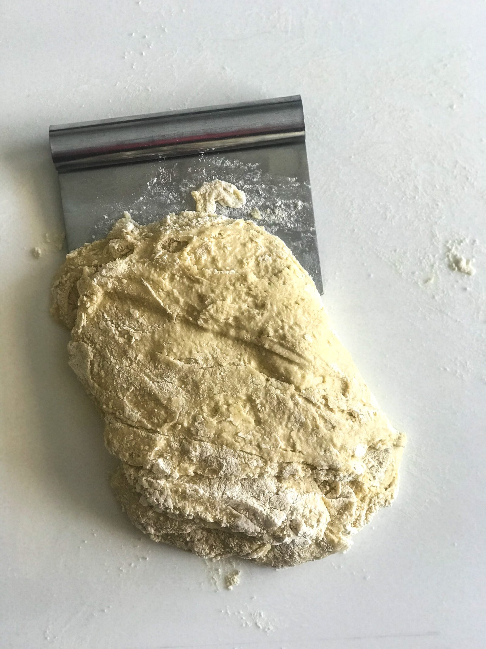 - Using your hands or a bench scraper, fold the dough over and add in the flour on your counter until it starts to get less sticky and loose.