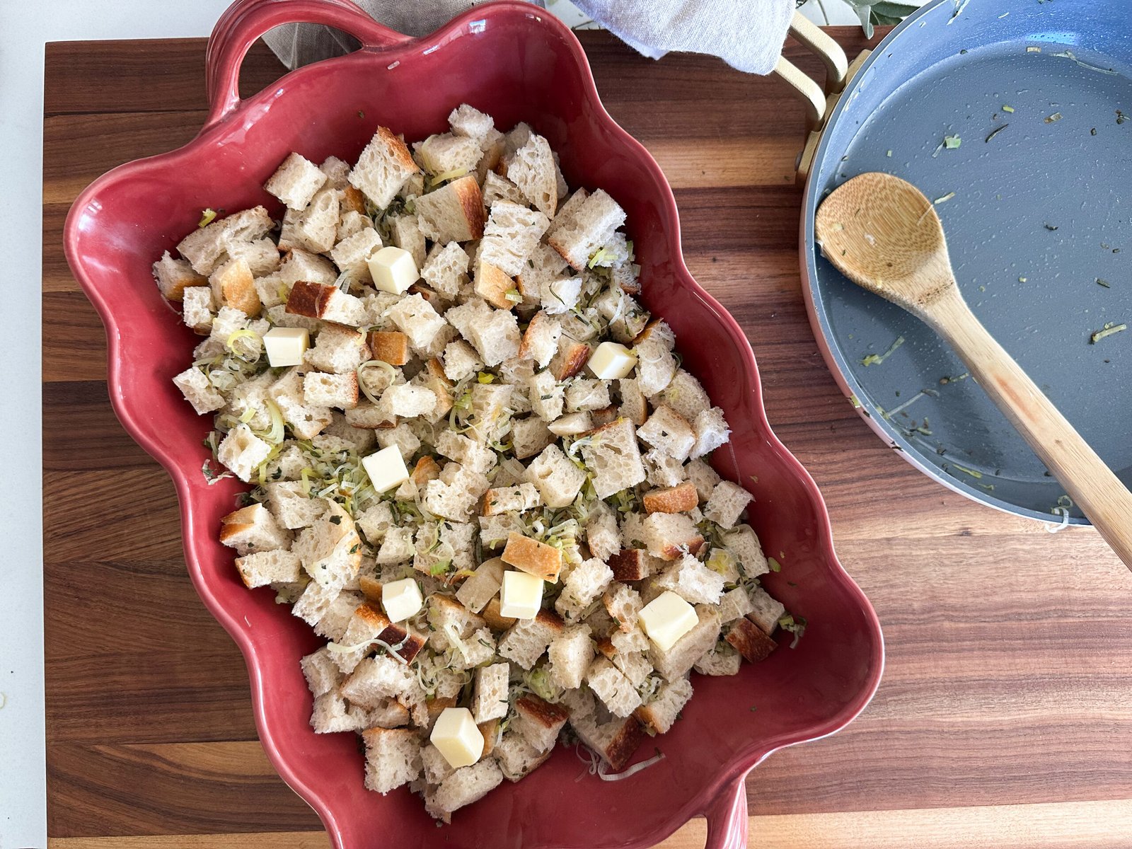 • In a casserole dish, add your sourdough bread cubes. Add in the butter, leek, herb mixture. Toss to combine the ingredients.