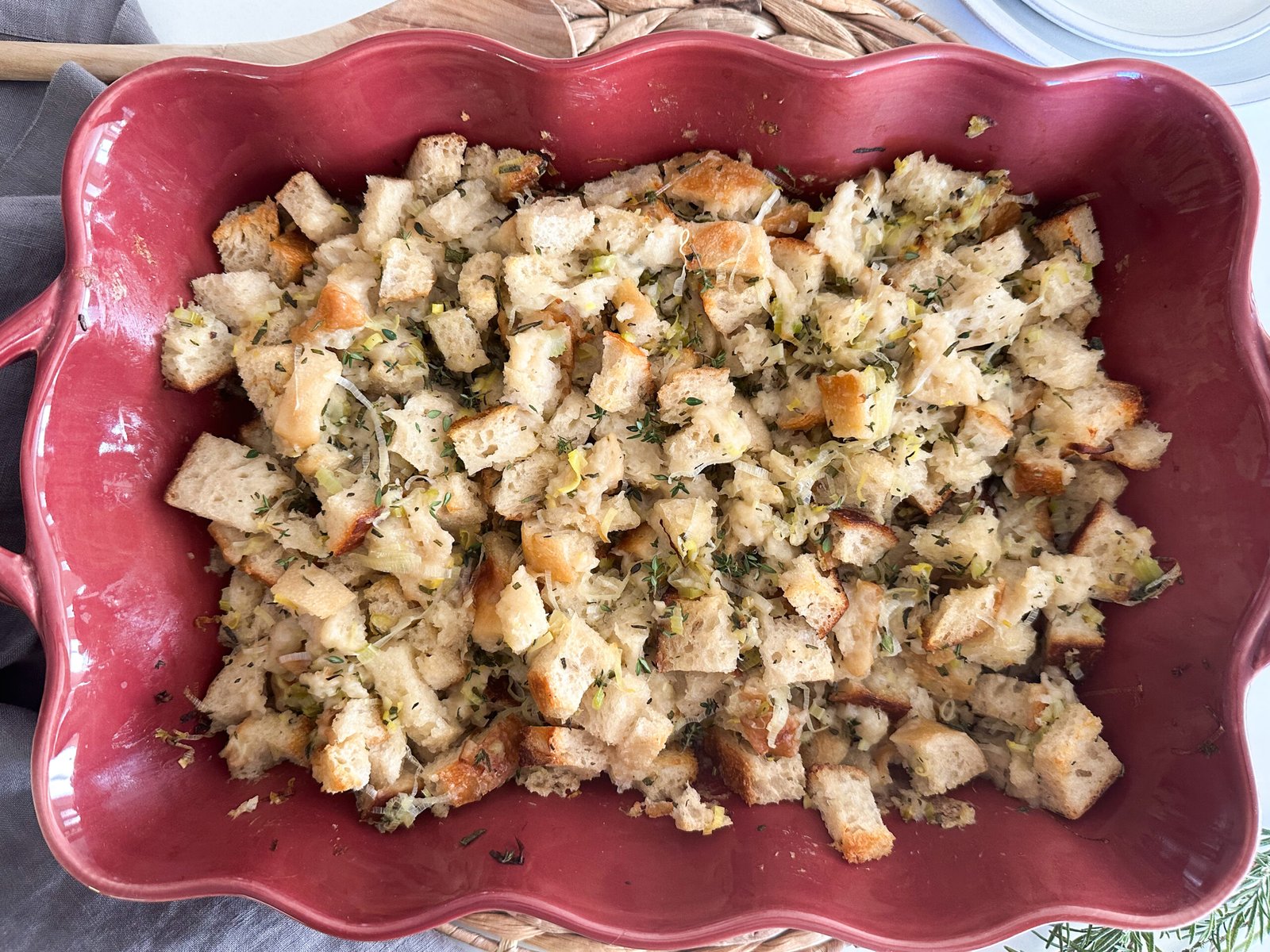 Simple sourdough stuffing will be must have favorite this holiday season.  From oven to table impress your guests with this simple twist of the classic. Rustic tangy sourdough tossed with a thinly sliced sweet leek and fresh herbs will have everyone loving this dish.